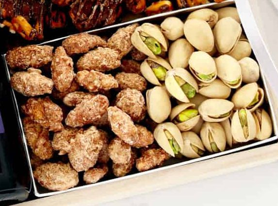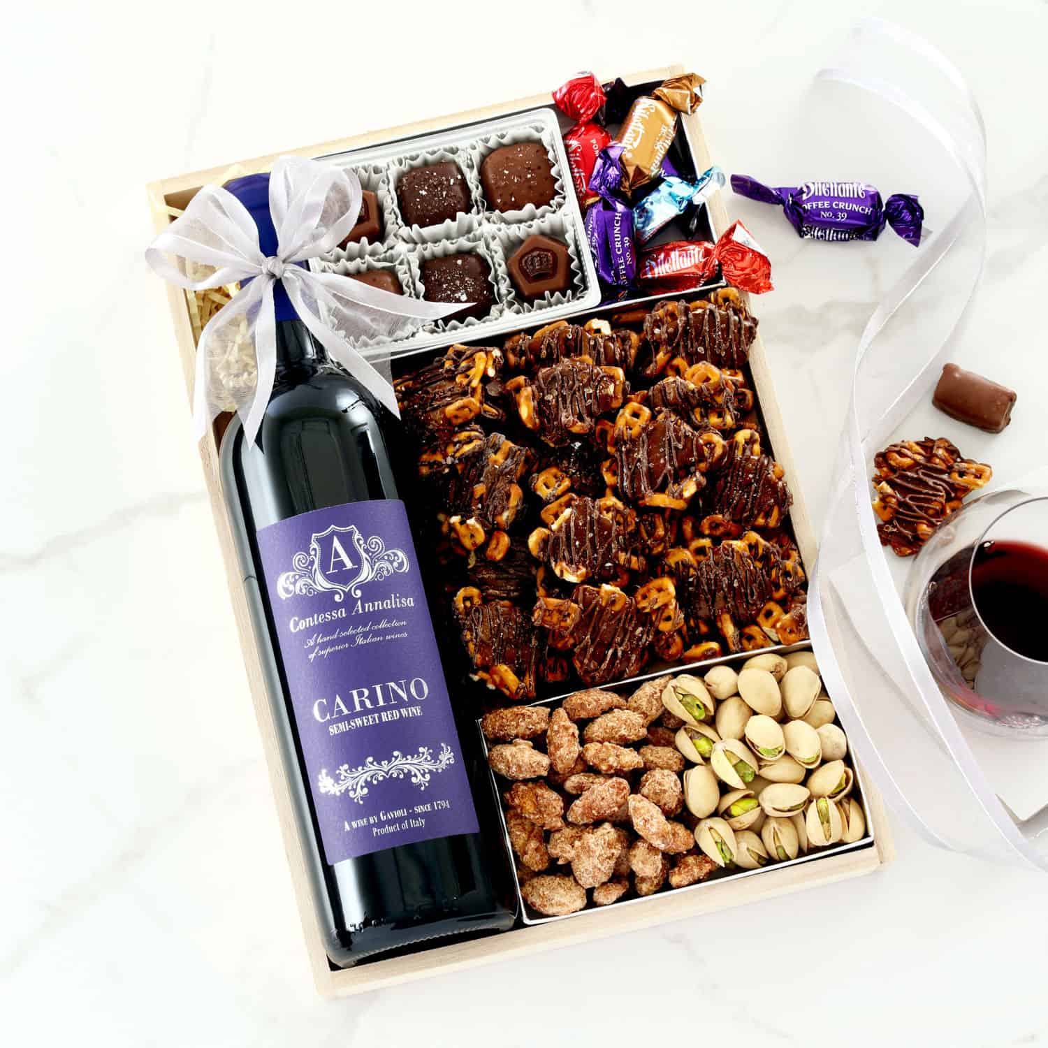 With a semi-sweet red wine that can please any palate, the wine tray is complemented perfectly with roasted nuts, chocolate drizzled pretzels, truffles, and much more. Someone you know deserves to indulge in the gourmet treats and rich surprises that come stocked in a gift tray.