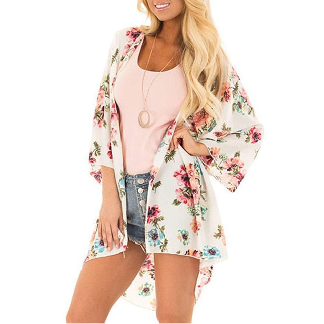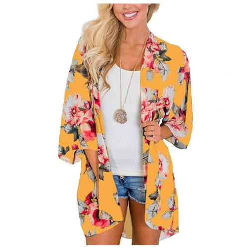 Women Floral Leopard Print Half Sleeve Shawl Chiffon Kimono